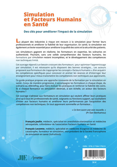 Cet ouvrage répond à un besoin croissant des formateurs : pour optimiser l’apprentissage par simulation, il est nécessaire qu’ils disposent des bonnes stratégies… Les auteurs proposent aux formateurs de s’approprier les concepts « facteurs humains », d’en acquérir les compétences spécifiques pour concevoir et animer les séances et d’interroger leur enseignement pour mieux transmettre les compétences non techniques aux apprenants.